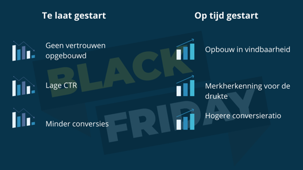 • Concurrentievoordeel: Wie eerder zichtbaar is, wint vaak al vóór de Black Friday-week het vertrouwen van klanten.