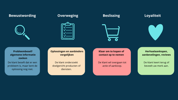 De customer journey – of klantreis – verloopt zelden lineair. Klanten kunnen springen tussen fases, maar door de reis op te delen in herkenbare stadia, kunnen we gerichter inspelen op hun noden. We onderscheiden doorgaans vier fases: