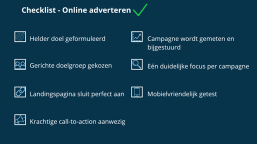 Oplossing: Stel per campagne een meetbaar doel op, bijvoorbeeld: “10 offerteaanvragen per week” of “25% meer webshopverkopen in het komende kwartaal”.